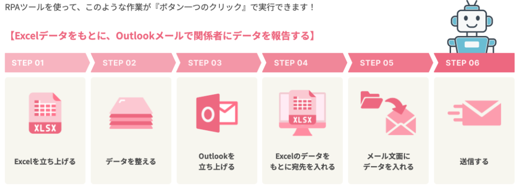 コピー&ペースト、メール送信、データ入力など、人が手で行っていた作業をロボットが正確に処理してくれます。